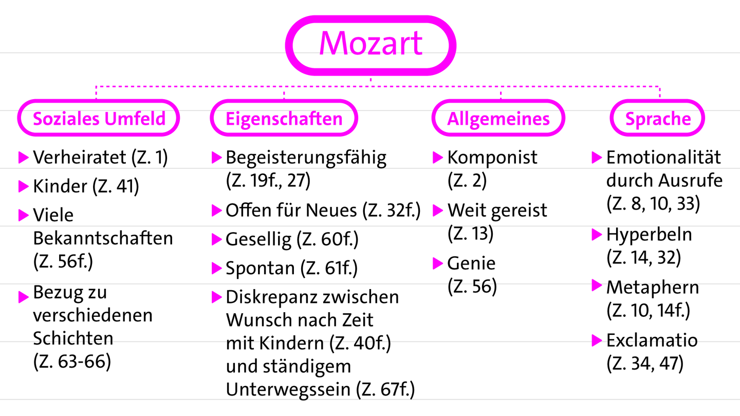 Erstelle zu folgendem Text eine Stoffsammlung. Wähle dabei aus den drei Arten (Stichpunktliste, Tabelle, Cluster) die für dich geeignete Form aus. Die Aufgabenstellung dazu lautet: „Charakterisiere die Figur Mozart“.