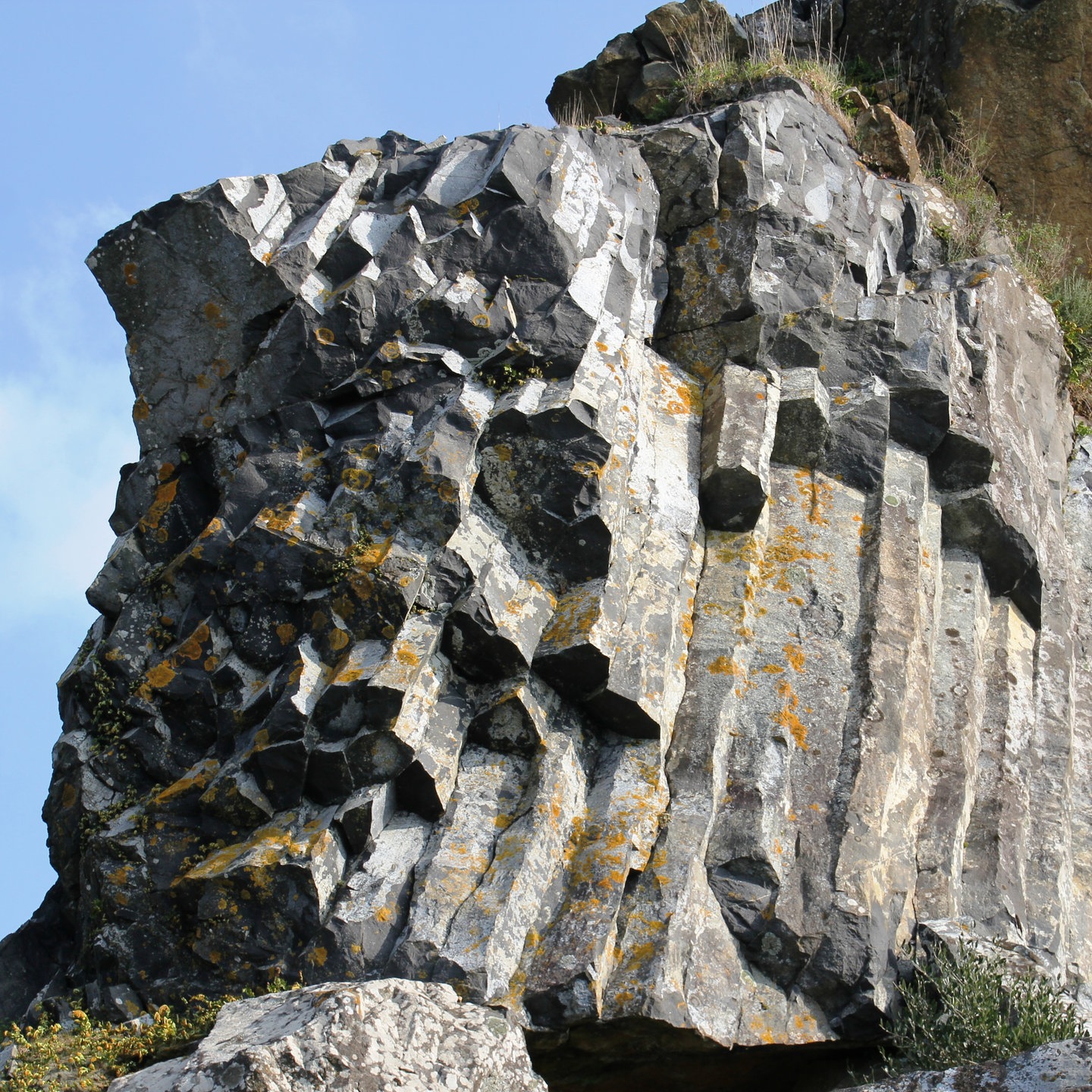 Auch der Basalt ist ein Vulkanit. Manchmal erstarrt er zu sechseckigen, eng aneinander liegenden Säulen, die aussehen, als wären sie in Form gegossen. Basalt bildet sich an der Erdoberfläche aus der gleichen Masse wie der Gabbro in der Tiefe.