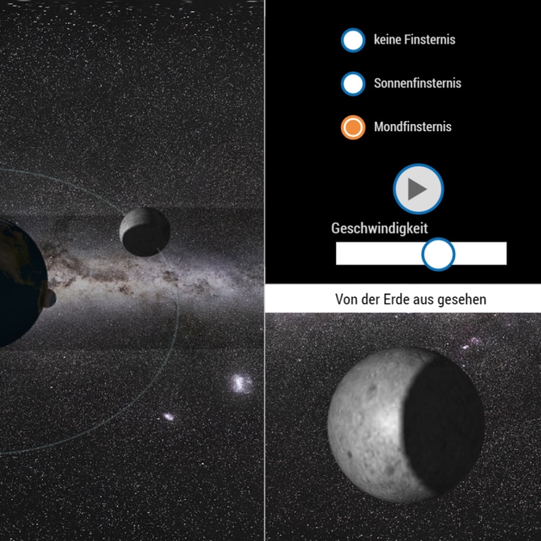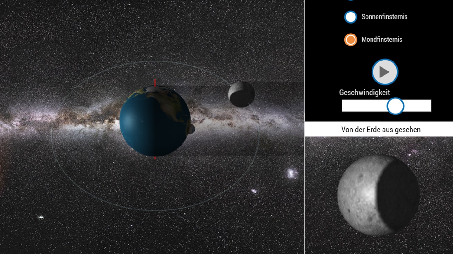 In der Mond-Simulation kann man die Erde vom Weltraum aus beobachten und dem Mond auf seiner Bahn um die Erde folgen. Mit dem Regler "Geschwindigkeit" kann man einstellen, wie schnell sich der Mond um die Erde dreht. In Wirklichkeit benötigt der Mond 27 Tage für eine Umrundung der Erde.
