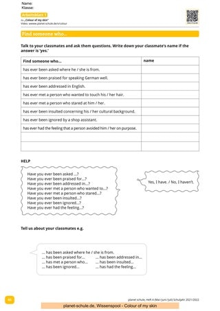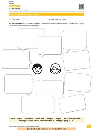 Als Einstieg in die Unterrichtsstunde kann eine offene und kommunikative Methode gewählt werden. Die Schüler*innen sollen mithilfe von Arbeitsblatt 1 Fragen formulieren, wie sie People of Colour häufig gestellt werden. Ein Austausch über die Gespräche mit den Mitschüler*innen soll anschließend im Plenum stattfinden.