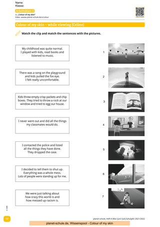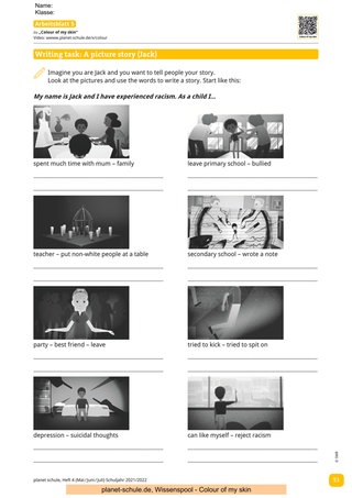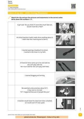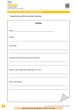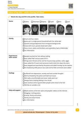 „Colour of my skin“ setzt sich mit dem Thema Rassismus und Diskriminierung im Alltag auseinander. Sechs Jugendliche berichten in ca. fünfminütigen Videos von ihren individuellen und sehr persönlichen Erfahrungen mit Rassismus. Anhand der Biografien der Jugendlichen erfahren die Schüler*innen, dass Rassismus keinesfalls ein Randphänomen oder etwa ein Problem der Vergangenheit ist. Die in den Filmen verwendete Sprache ist aufgrund von Sprechgeschwindigkeit und Aussprache nicht immer leicht zu verstehen und daher ist ein Einsatz der Filme frühestens ab Klasse 7 sinnvoll. Eine Vorentlastung verschiedener Wörter von Seiten der Lehrkraft wäre je nach Film wichtig.