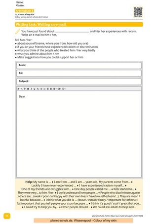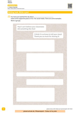 Die Arbeitsblätter 6–8 dienen zur Weiterarbeit und können, nachdem die Filme angeschaut und besprochen wurden, genutzt werden. In einer Gruppenarbeit werden die Schüler*innen angehalten, mithilfe von Arbeitsblatt 6 unterstützende Kommentare zu schreiben. Arbeitsblatt 7 bietet die Möglichkeit, der von Rassismus betroffenen Person Fragen zu stellen. Einen ausführlicheren Schreibanlass bietet Arbeitsblatt 8. Hier sollen die Schüler*innen der Hauptperson des jeweiligen Filmes eine E-Mail schreiben. Unabhängig davon, welcher Arbeitsauftrag gewählt wurde, sollten auf jeden Fall die Ergebnisse besprochen werden.