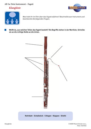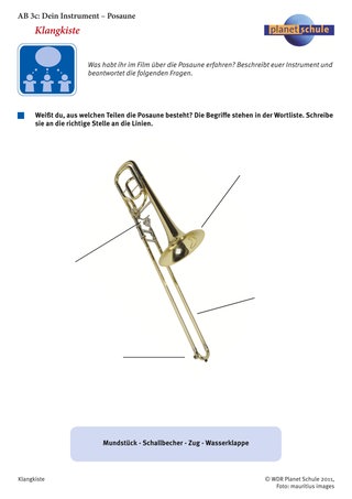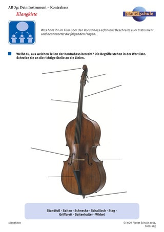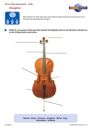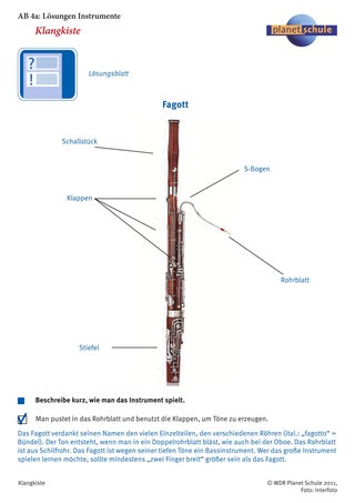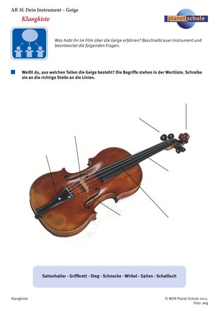 Nach dem Film werden die Gruppen ausgelost. Die Kinder erhalten dazu eine Karte mit dem Foto des Instruments (Arbeitsblatt 2 "Gruppenkarten"). In Gruppen bearbeiten sie nun Arbeitsblatt 3a-g "Dein Instrument". Wenn sie fertig sind, können sie ihre Lösungen der Wissensfragen mithilfe des Lösungsblattes vergleichen (Arbeitsblatt 4 "Lösungen Instrumente").