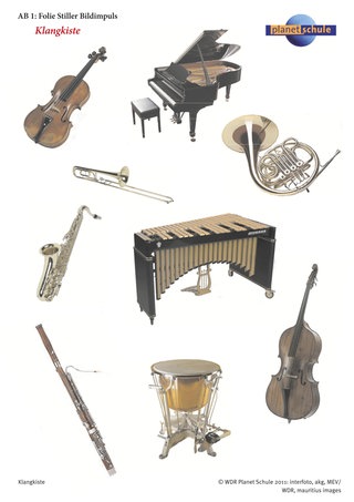 Zu Beginn ist ein Computer mit Internetanschluss, Lautsprechern und Beamer notwendig. Als Einstieg in die Unterrichtseinheit dient ein stummer Impuls. Arbeitsblatt 1 "Folie Stummer Impuls" zeigt verschiedene Orchesterinstrumente und wird mit dem Beamer vergrößert gezeigt. Die Kinder äußern sich spontan, welche Instrumente sie kennen und was sie über sie wissen.