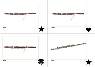 Anschließend werden neue Gruppen gebildet: Die Schüler und Schülerinnen mit demselben Symbol auf der ihrer Gruppenkarte (AB 2 "Gruppenkarten") finden sich zusammen. In den neuen Gruppen ist jedes Instrument vertreten. Sie erhalten einen Satz Memorykarten mit verschiedenen Instrumenten aller drei Instrumentenfamilien (AB 5 "Kartensatz Memory").