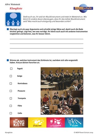 Zum Abschluss treten die Instrumente in einen Wettstreit, welches das Schönste im ganzen Land ist. Dazu schlüpfen die Gruppen, die ein Instrument bearbeitet haben, in die Rolle ihres Instruments und preisen sich an (Arbeitsblatt 6 "Wettstreit"). Jeweils drei oder vier Instrumente treten gegeneinander an und das Publikum entscheidet danach per Abstimmung oder durch die Lautstärke des Applauses.