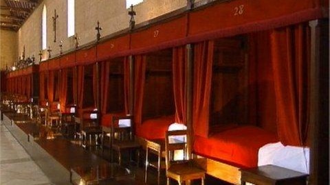 Der Eintritt in ein Kloster bot die größtmögliche Garantie auf ein positives Leben im Jenseits. Ohne persönlichen Besitz, allein um Gott zu dienen, betete man, las religiöse Schriften und verdiente seinen Unterhalt mit eigener Hände Arbeit. Eine Aufgabe der Klöster bestand in der Versorgung von Bedürftigen. Dabei spielten Spitäler als Fürsorgeeinrichtungen im Mittelalter eine kaum zu unterschätzende Rolle. Sie dienten als Anlaufstation für Pilger und Kranke, Alte und Waisen. Meist von Klöstern verwaltet, finanzierten sich die Spitäler aus Spenden, Schenkungen, Stiftungen, Pfründen und Testamentszuwendungen. Die Gründungen entsprachen der Religiosität der Menschen, die aufgefordert waren, Gutes zu tun. Die Träger entschieden, wie lange jemand im Spital bleiben durfte. In der Regel lagen Kranke in einer Krankenhalle, bis zu drei Personen in einem Bett. Pfründner waren meist besser untergebracht, abhängig von dem gezahlten Beitrag. Pflegekräfte waren vor allem Frauen; für die medizinische Behandlung waren Ärzte, Bader und Scherer zuständig.