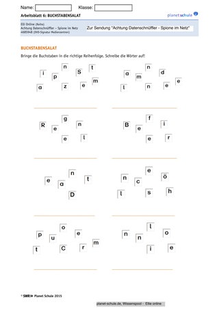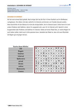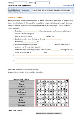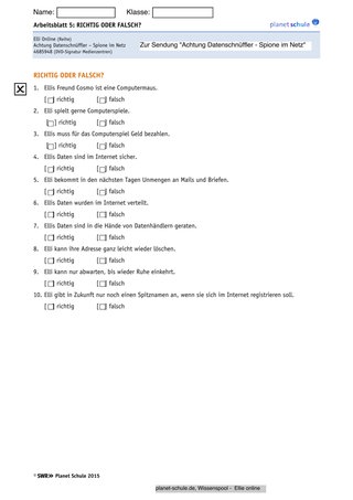 Auf dem ersten Arbeitsblatt nähern sich die Schüler Ellis Situation. Durch die Fragen bekommt der Lehrer einen Einblick wie viele seiner Schüler E-Mail Adresse haben, diese nutzen und Infos über die Nutzung von Spieleseiten im Internet. Dieses Arbeitsblatt gibt es in zwei Varianten. Auf dem zweiten Arbeitsblatt widmen sich die Schüler genauer Ellis Problem. Wie konnte es dazu kommen? Was sind die Folgen? Auf Arbeitsblatt 3 geht es um Sicherheit im Internet. Welche Regeln muss ich beachten, wenn ich im Internet surfe? Arbeitsblatt 4 geht über den Film hinaus und fordert die Schüler auf, über weitere Gefahren im Internet nachzudenken und Regeln zu formulieren. Auf dem fünften Arbeitsblatt geht es um falsche und wahre Aussagen. Das letzte Arbeitsblatt (Buchstabensalat) ist zur Differenzierung und als Puffer gedacht.