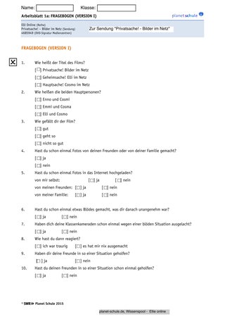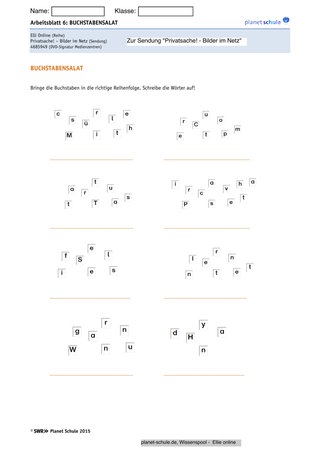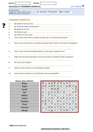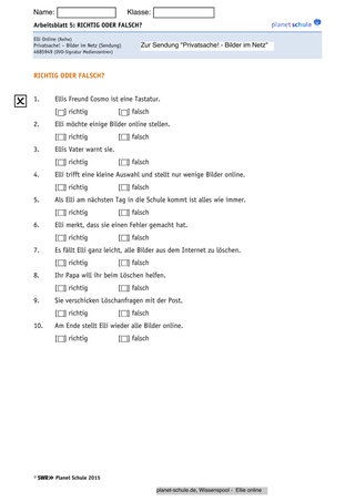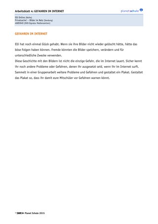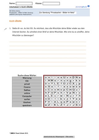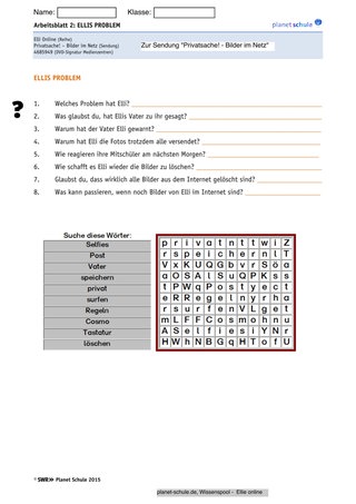 Auf dem ersten Arbeitsblatt nähern sich die Schüler Ellis Situation. Durch die Fragen gehen sie den Film noch einmal durch. Dieses Arbeitsblatt gibt es in zwei Varianten. Auf dem zweiten Arbeitsblatt widmen sich die Schüler genauer Ellis Problem. Wie konnte es dazu kommen? Was sind die Folgen? Auf Arbeitsblatt 3 geht es um die Lösung von Ellis Problem. Wie schafft Elli es Bilder aus dem Internet entfernen zu lassen? Arbeitsblatt 4 geht über den Film hinaus und fordert die Schüler auf, über weitere Gefahren im Internet nachzudenken. Auf dem fünften Arbeitsblatt geht es um falsche und wahre Aussagen. Das letzte Arbeitsblatt (Buchstabensalat) ist zur Differenzierung und als Puffer gedacht.