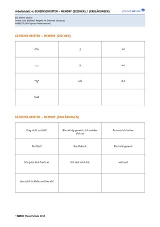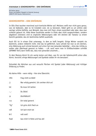 Das AB ist eine Einführung zur Abkürzungs- und Icons-Terminologie, die im Internet üblich, aber – aus „Benimm-Sicht“ - teilweise nicht korrekt ist. Das AB listet einige Abkürzungen und Ausdrücke, die in Ellis Chat gefallen sind, mit der dazugehörigen „Übersetzung“ auf. Mit diesem Vorwissen sollen die Schüler im Anschluss das Memory (AB 4) spielen können. Der Text soll lediglich gelesen werden. Die Ausdrücke sollten gemeinsam mit dem Lehrer auf jeden Fall hinsichtlich ihrer Tauglichkeit für den Chat bewertet werden.