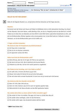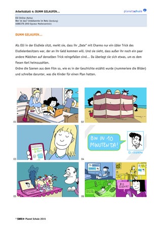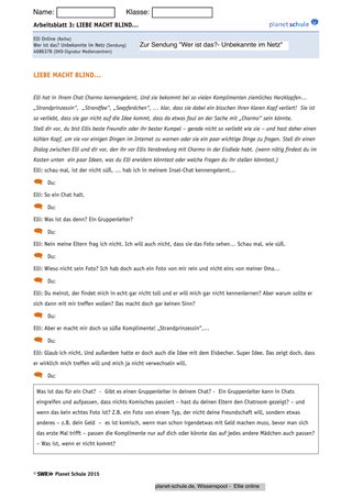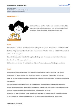 Mit dem Arbeitsblatt soll Klarheit dafür geschaffen werden, was Elli tatsächlich im Chatroom passiert ist. Teile der Filmgeschichte werden mit minimalen – aber sehr bedeutungsvollen – Fehlern nacherzählt. Die Schüler sollen die Fehler finden und die korrekten Handlungsabläufe erinnern. Dabei sollen die Schüler ihr Bewusstsein dafür ausbauen, was es bedeutet, online Menschen kennenzulernen. Die Aufgabe lässt sich gut als Einzelarbeit mit nachfolgender Besprechung im Plenum erledigen.