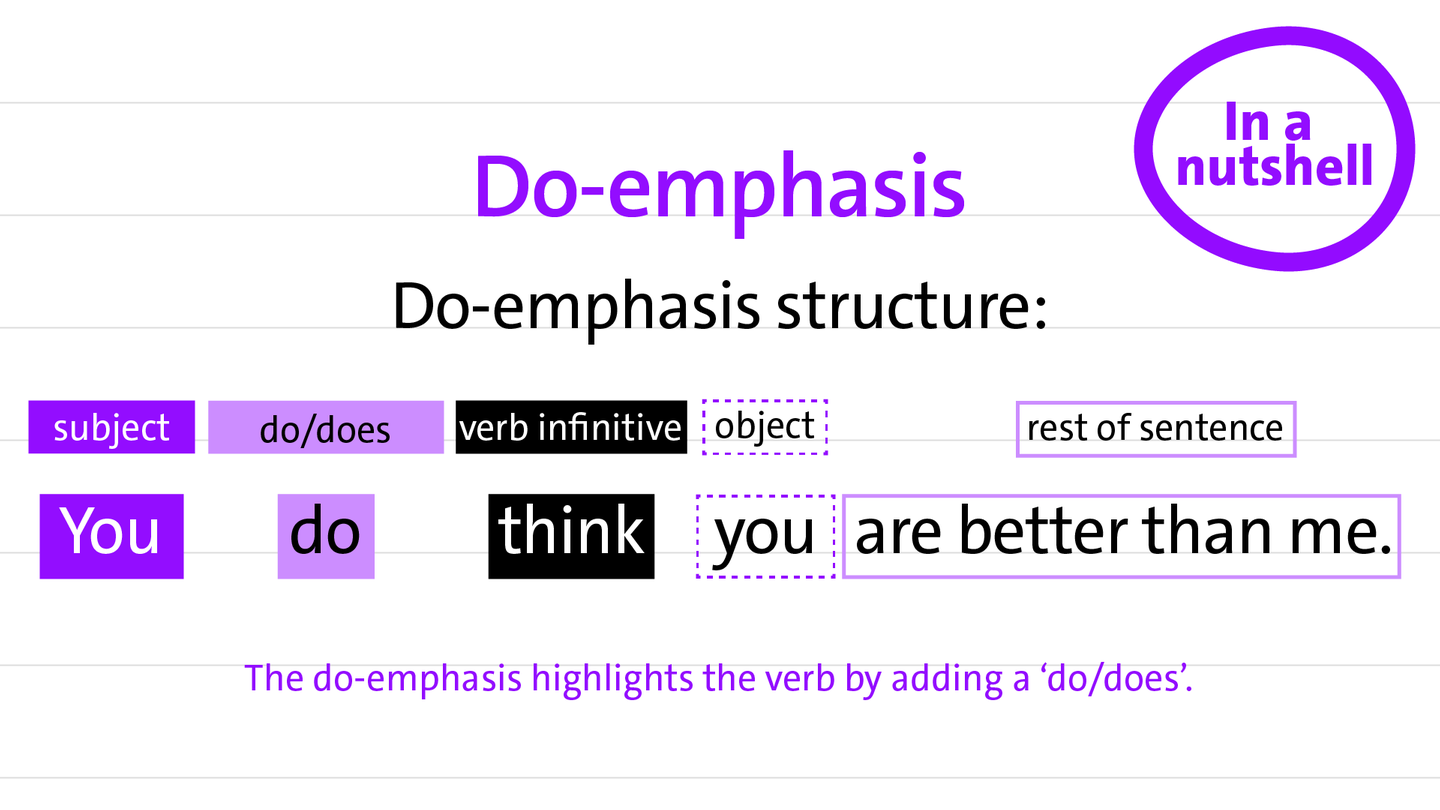 In English, emphasis is used to draw attention to important information by altering the sentence structure or by adding certain words. You can use it to express surprise or strong emotions. There are a number of common techniques that can be used to do so, such as the do-emphasis or the inversion, which we will now take a closer look at: