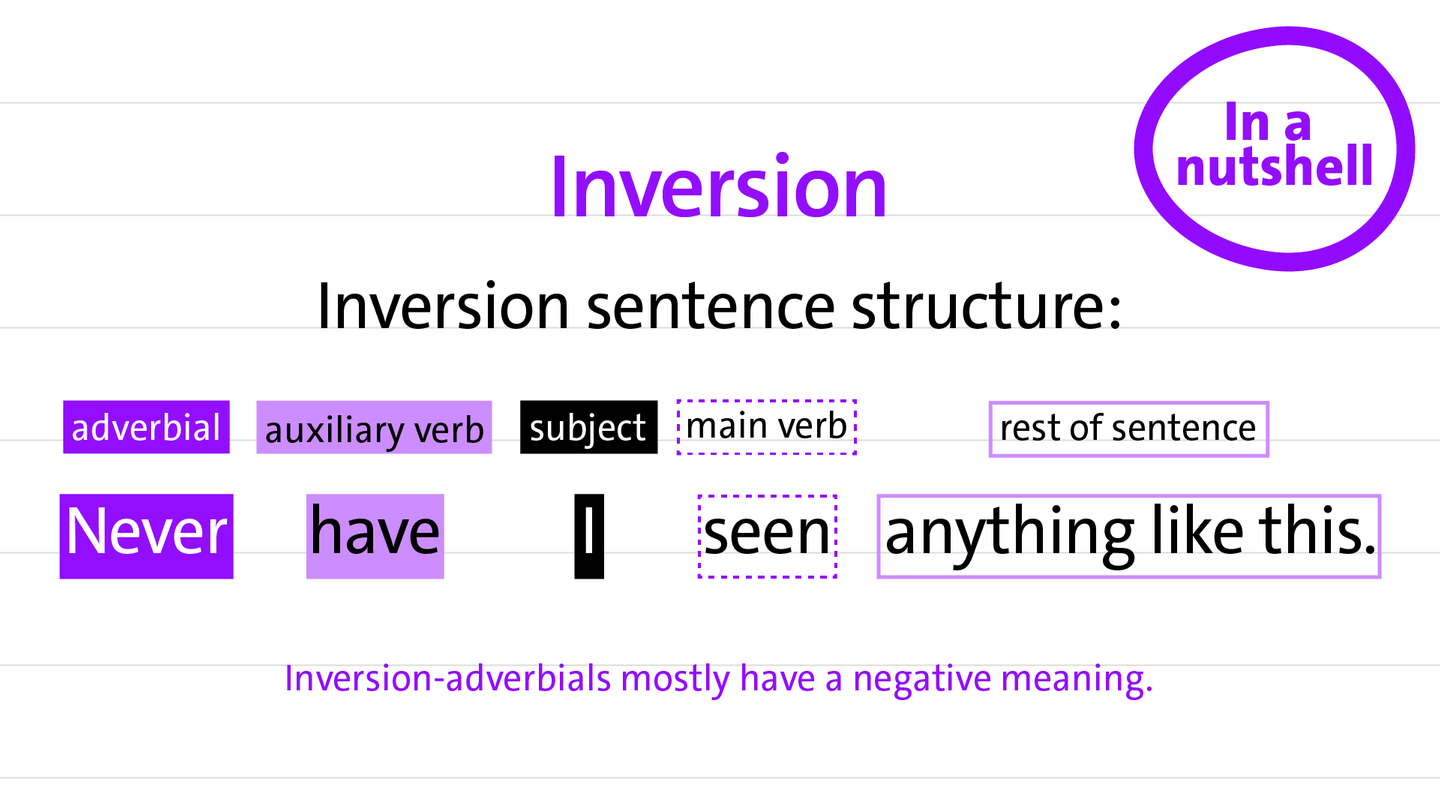 Inversion-adverbials mostly have a negative meaning. Other common inversion adverbials are “rarely”, “hardly”, “little”, or “seldom”.