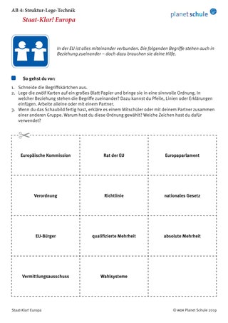 Die Schülerinnen und Schüler sollen mithilfe der Struktur-Lege-Technik zwölf Begriffe zum Gesetzgebungsprozess in der EU und zur EU-Wahl miteinander in Beziehung bringen. Dabei werden Begriffe, die eng miteinander zu tun haben, nah zusammengelegt, andere weiter entfernt. Mit Pfeilen und Symbolen kann verdeutlicht werden, wie die Begriffe zusammenhängen. Auf AB 2 "Beispiel Struktur-Lege-Technik" verdeutlicht exemplarisch ein Begriffsnetz zum Thema Schule diesen Ansatz.