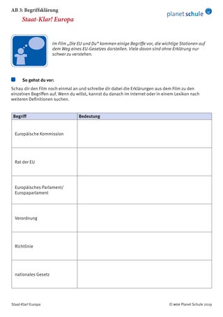 Um die EU-Begriffe sinnvoll miteinander in Beziehung setzen zu können, müssen die Schülerinnen und Schüler sie zunächst vollständig verstanden haben. Sie erhalten dafür zunächst eine Tabelle, in der die Begriffe aufgelistet sind. Dann sehen sie den Film noch einmal an, wenn möglich im individuellen Tempo (beispielsweise im PC-Raum). In die Tabelle tragen sie anhand des Films Definitionen für die Begriffe ein.