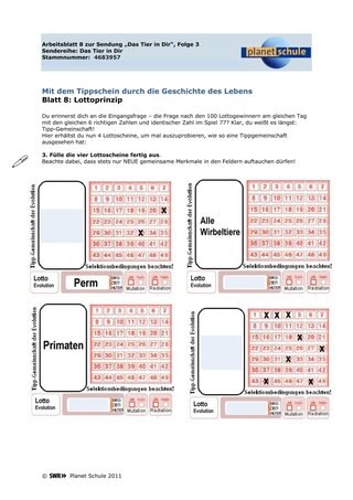 Das Suchen nach verwandtschaftlicher Nähe, über Homologien, Rudimente und Atavismen, mittels fossiler Hinweise oder moderner molekularbiologischer Belege, durch die biogenetische Grundregel und vieles mehr soll (im Sinne des Lottoprinzips) die Abstammungslinien und damit die gemeinsame Herkunft aller Lebewesen aufzeigen. Im Rahmen der synthetischen Theorie der Evolution lernen die Schüler auch die Zusammenhänge bei Artneubildung, adaptiver Radiation, Gendrift, Selektion und Separation u.a. kennen.