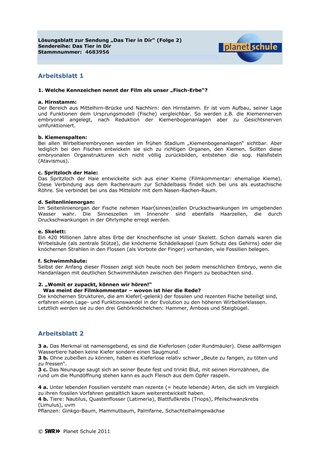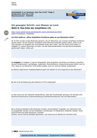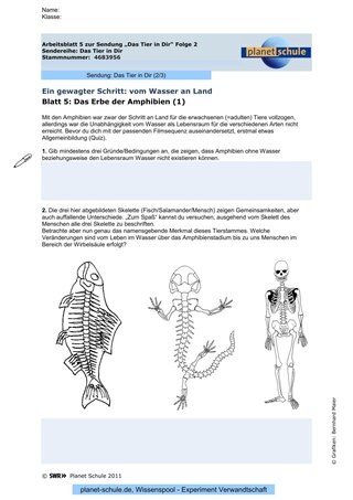 „Ohne Amphibienvorfahren gäbe es uns Menschen nicht“, lautet der Filmkommentar und zeigt weitere Veränderungen vom Fisch zum Amphib: stabileren Knochenbau, zugleich hohe Beweglichkeit des Kopfes durch die Entstehung des Halses („Fische haben keinen Hals“), vier Extremitäten mit Händen und Füßen, mit Zehen und Fingern (in der Regel je fünf).