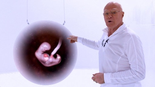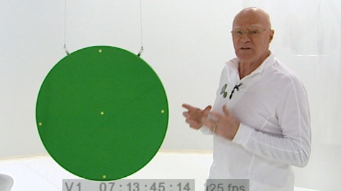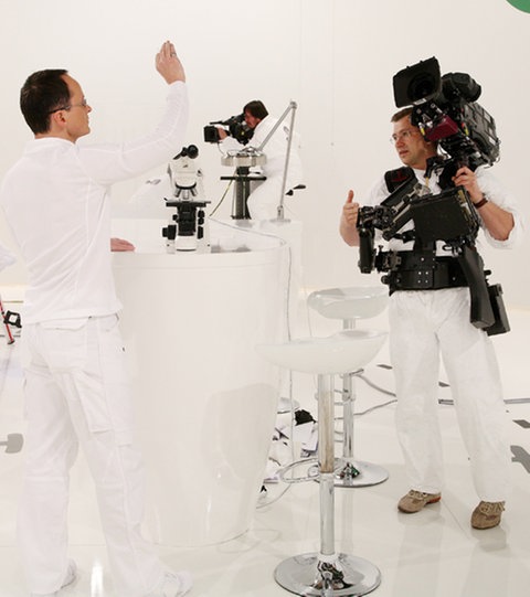 Die gleiche Technik kam auch im Studio zum Einsatz: In dem in Weiß gehaltenen „Labor“ befanden sich mehrere grüne Flächen, die in der Nachbearbeitung z.B. in einen Globus, oder einen Embryo verwandelt wurden. Auch hier agierten unsere Protagonisten quasi „blind“ mit den grünen Pappschildern. Aart Gisolf nahm es gelassen: „Also wenn ich so etwas erkläre, was ich nicht sehe, dann sehe ich es trotzdem. Dann stelle ich es mir vor und erkläre das, was ich mir vorstelle. Und dann denke ich auch, dann sollen das die Techniker mal hinkriegen was ich hier sage, denn ich stelle es mir vor und so wird es jetzt gesagt.“ Und dementsprechend werden die Bilder dann von den 3DGrafikern auch angepasst.