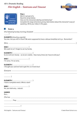 Die Schülerinnen und Schüler sind bereits mit dem Stil der Serie vertraut. Vor dem Ansehen dieser Folge erhalten sie einen Auszug des Filmscripts und ziehen daraus Rückschlüsse auf den Inhalt der gesamten Folge (Arbeitsblatt 1 "Dramatic reading"). Die Szene soll in Form des "dramatic readings" vorgetragen werden. Die Schüler lesen den Auszug zunächst alleine. Danach finden sie sich in kleinen Gruppen zusammen, um die Szene auszugestalten. Sie ergänzen gemeinsam im Manuskript Anweisungen für die Schauspieler: Sollen sie leise oder laut sprechen, wütend oder fröhlich? Danach lesen sie den Text mit verteilten Rollen. Einige Gruppen tragen ihre Version in der Klasse vor.