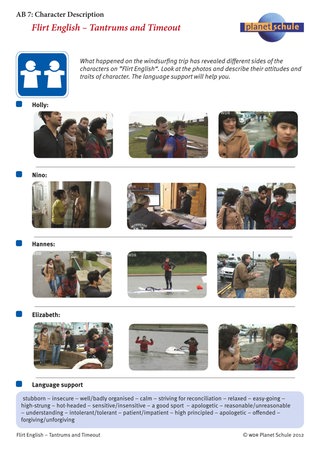 Auf Arbeitsblatt 7 "Character description" ordnen die Schülerinnen und Schüler den vier Protagonistinnen und Protagonisten Eigenschaften zu und erweitern so ihren Wortschatz im Bereich von Charaktereigenschaften. Das Arbeitsblatt enthält "language support".