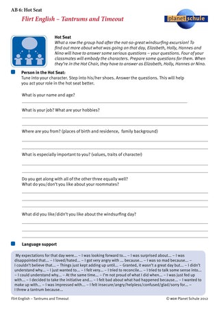 Anspruchsvoller ist die Anschlussaufgabe "Hot seat". Einige Schülerinnen und Schüler versetzen sich in die Rolle von Nino und Elz und müssen sich auf dem heißen Stuhl den Fragen der Mitschüler stellen. Sie sollen ihre Handlungen, Gefühle und Reaktionen beschreiben und eventuell verteidigen. Die Schüler bereiten sich in Gruppen auf ihre Rollen vor. Arbeitsblatt 6 "Hot seat" steuert Hilfestellungen und Redemittel bei. Der "Hot Seat" kann von jeweils zwei Schülern eingenommen werden.