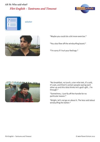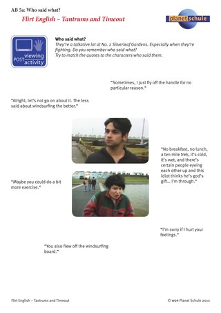 Mithilfe von Arbeitsblatt 5 "Who said what" sichern Sie zunächst wichtige Inhalte des Streits. Die Schülerinnen und Schüler ordnen die Zitate den Personen zu. Als Hilfestellung zeigen die Screenshots die Personen jeweils in der Sprechsituation. Wenn die Schülerinnen und Schüler Zugang zum Computer haben, können sie die entsprechenden Szenen im Film ansehen, um ihre Lösung zu kontrollieren. Ein Lösungsblatt hängt an.
