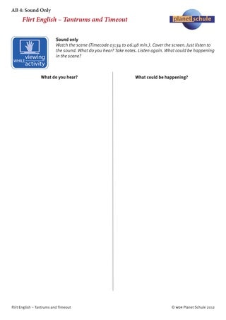 Für eine zweite Variante wurde auf Arbeitsblatt 4 "Sound only" eine andere Szene gewählt, die die Schüler noch nicht kennen. Das Verfahren bleibt gleich, nur dass diesmal keine Sätze vorgegeben sind, sondern die Schülerinnen und Schüler unter den ausgewählten Fotos in eigenen Sätzen beschreiben sollen, was dort passiert.