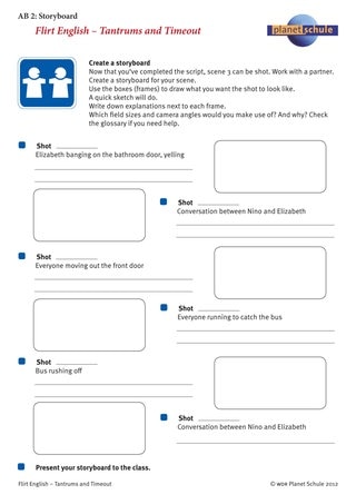 Anschließend überlegen sie sich ein Storyboard für die Szene. In welchen Kamera-Einstellungsgrößen werden die einzelnen Situationen wohl gedreht? Bei dem Begleitmaterial der Folge 3 gibt es Arbeitsblätter, in denen die Schüler die Kameraführung einer Szene analysieren müssen. Eine ähnliche Aufgabe wird hier angeboten: Die Schüler arbeiten wieder in Kleingruppen und zeichnen ein Storyboard mithilfe von Arbeitsblatt 2 "Storyboard". Das Arbeitsblatt enthält Hilfestellungen für das Zeichnen und die Begründung für die einzelnen Einstellungen sowie Erklärungen und Beispiele für Einstellungsgrößen und ihre Funktion. Die Arbeitsgruppen können ihre Ergebnisse austauschen und gegenseitig kommentieren. Oder sie können auch in einem Galeriegang besichtigt werden.