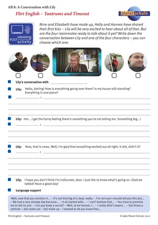 Den Abschluss kann wieder ein Gespräch mit Lily bilden. Die Schülerinnen und Schüler bereiten mit Hilfe des Arbeitsblattes 8 vor, wie ein WG-Mitglied Lily von den aufregenden Geschehnissen berichtet.