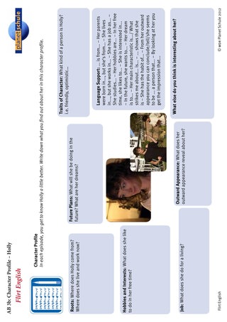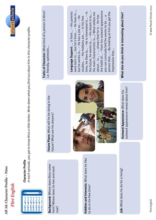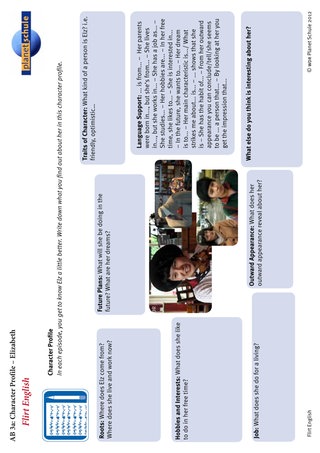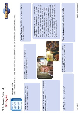 Die Schülerinnen und Schüler füllen jeweils nach dem Ansehen einer Folge Arbeitsblatt 3 "character profile" für die Hauptpersonen aus. Was haben sie über sie erfahren? Welchen Eindruck haben sie von der Person? Das Arbeitsblatt schlägt eine Gliederung des Profils in Bereiche vor und bietet "language support" an. Von Folge zu Folge lernen die Schüler die Protagonisten der Serie besser kennen. Sie füllen deshalb das Profil immer vollständiger aus, eventuell ändern sie auch manche der Beschreibungen wieder. Auch das kann ein Diskussionspunkt sein.