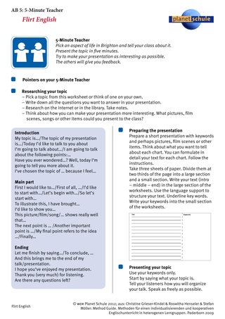 Flirt English spielt in Brighton. Um Brighton besser kennenzulernen, können zu jeder neuen Folge ein oder zwei Schüler ein Kurzreferat über einen Aspekt von Brighton halten. Auf dem Arbeitsblatt haben wir Vorschläge für fünf Referatsthemen (für alle Folgen außer der ersten) gemacht. Das Arbeitsblatt "5-minute teacher" bietet Hinweise für die Form einer Präsentation mit "language support" und ein Raster für die Klasse, mit dem die Schüler den Kurzvortrag bewerten können.
