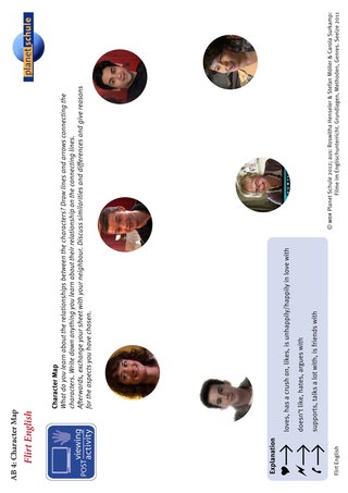 Das Arbeitsblatt 4 "character map" ist ähnlich aufgebaut, legt den Schwerpunkt aber auf die Beziehungen der Protagonisten untereinander. Welche Rolle übernehmen sie in der WG: Sind sie eher verständnisvoll, ausgleichend, kritisch oder streitbar? Wer übernimmt die Führung, wer sorgt für die gute Stimmung? Bahnen sich Beziehungen oder Konflikte an?
