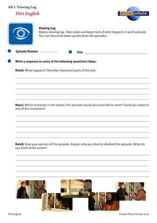 Als unterstützende Arbeitsblätter für die Verständnissicherung dienen die Arbeitsblätter 1 "viewing log" und 2 "Feel-o-Meter". Sie sind als "long-term while-viewing task" für den gesamten Film gedacht. Das "viewing log" gibt den Schülern ein Raster an die Hand, mit dem sie Notizen zum Inhalt der Folge, zu den Personen und Handlungen machen können. Sie halten gleichzeitig ihre Seheindrücke fest: Was halten sie von den Charakteren und wie fanden sie die Handlung der Folgen? Die Notizen können anschließend genutzt werden, um in der Lerngruppe die Eindrücke auszutauschen.