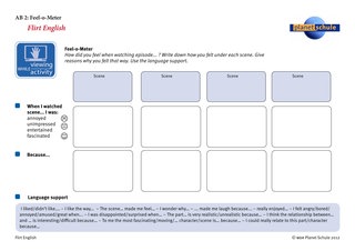 Mit dem "Feel-o-Meter" können sie über ihre eigenen Reaktionen Buch führen: Was hat ihnen besonders gut gefallen, was war für sie der Höhepunkt oder was gefiel ihnen weniger? Sie können während des Films Kommentare und im Anschluss stichpunktartig Begründungen notieren. Das Arbeitsblatt dient auch als Unterstützung für das Unterrichtsgespräch direkt nach dem Film, bei dem sie ihre Seheindrücke äußern. Dafür enthält das Arbeitsblatt "language support".
