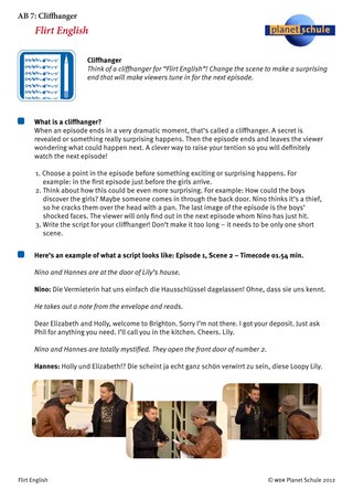 Eine kreative Aufgabe könnte es sein, zum Abschluss jeder Folge einen Cliffhanger zu erfinden. Wie könnte ein Cliffhanger aussehen, der auf die gerade besprochene Folge hinweist? Er muss also ans Ende der vorherigen Folge passen. Arbeitsblatt 7 "cliffhanger" beschreibt die Aufgabe und erklärt, was ein Cliffhanger ist. Dort gibt es auch Vorschläge zum Vorgehen.