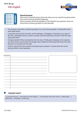 Schließlich können sich die Schülerinnen und Schüler in zwei etwas anspruchsvolleren Aufgaben mit dem Format der Soap Opera beschäftigen. Als "writing task" schreiben sie nach jeder Folge ein kurzes "recap" über das Geschehene, wie man es zu TV-Soaps im Internet finden kann, damit der Zuschauer weiß, was bisher geschah. Es werden kurz die wesentlichen Handlungsstränge sowie die Entwicklung der Beziehungen beschrieben. Auf Arbeitsblatt 6 "recap" finden die Schüler eine Beschreibung der Aufgabe mit Längenangaben sowie "language support".