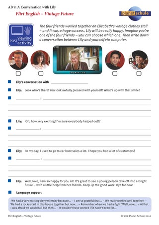 Den Abschluss bildet das traditionelle Gespräch mit Lily. Was erzählen die vier ihrer Landlady von ihrem Erfolg auf dem Flohmarkt? In Kleingruppen bereiten die Schüler jeweils ein Gespräch eines WG-Bewohners mit Lily vor. Arbeitsblatt 9 "Conversation with Lily" gibt Hilfestellung und kann genutzt werden, um Stichpunkte für das Gespräch vorzubereiten, damit es im Anschluss der Klasse vorgespielt werden kann.