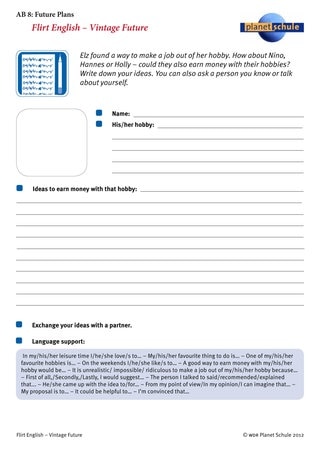 Elz hat aus ihrem Hobby einen Beruf gemacht, zumindest will sie sich als Modedesignerin versuchen. Was könnten die anderen Mitbewohner aus ihren besonderen Interessen und Hobbys machen? Hannes liebt Computer, Holly und Nino Sport ... Mithilfe von Arbeitsblatt 8 "Future Plans" entwickeln die Schülerinnen und Schüler Ideen. Alternativ können sie auch über sich selbst oder über Freunde schreiben.