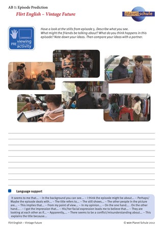 Arbeitsblatt 1 "Episode prediction" zeigt Screenshots von verschiedenen Szenen aus dem Film. Die Schülerinnen und Schüler betrachten die Fotos, beschreiben sie und spekulieren, was in der Folge wohl passiert.