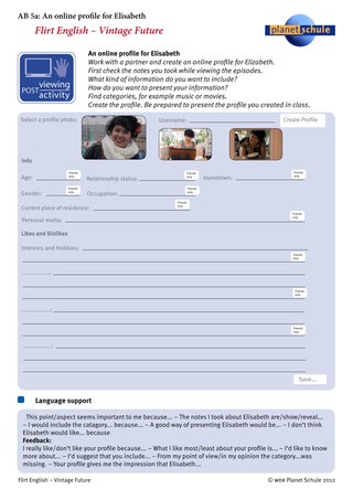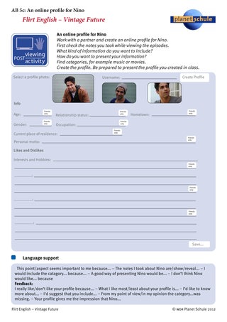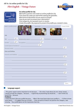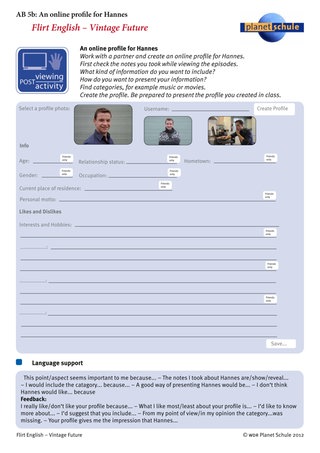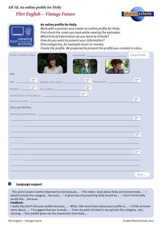 Die Schülerinnen und Schüler haben die Protagonisten nun bereits ziemlich gut kennengelernt und entwerfen ein Profil für ein soziales Netzwerk für Hannes, Holly, Nino und Elz. Als Vorlage dient Arbeitsblatt 5 "Online profile".