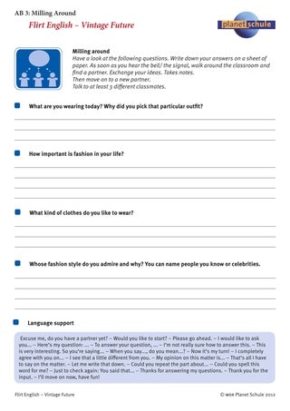Im Anschluss können sie die Vokabeln mit der Methode "Milling around" anwenden. Das ist eine einfache Form des Partnergesprächs, bei der die Tandems spontan gebildet werden. Die Schülerinnen und Schüler wandern mit dem Arbeitsblatt 3 "Milling around" in der Hand durch die Klasse. Auf ein Zeichen der Lehrerin oder des Lehrers hin sprechen sie den Schüler an, der ihnen am nächsten ist. Sie stellen sich gegenseitig die Fragen zu ihrer Kleidung auf dem Arbeitsblatt und machen sich Notizen zu den Antworten. Wenn sie fertig sind, wandern sie wieder durch die Klasse und suchen sich einen neuen Partner. Alle Schüler sollen in der festgelegten Zeit mehrere Gespräche führen.