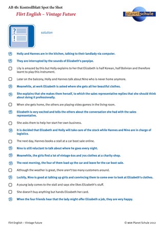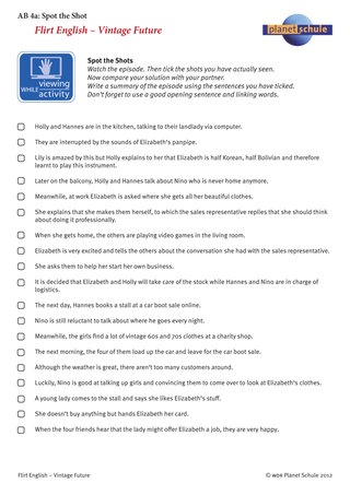 Zur Verständnissicherung während des Films dient Arbeitsblatt 4 "Spot the shot". Die Schülerinnen und Schüler bekommen eine Liste mit Handlungselementen, aus denen sie diejenigen identifizieren müssen, die sie in der Folge tatsächlich sehen. Auf dem Arbeitsblatt stehen auch erfundene Handlungen. Die Schülerinnen und Schüler lesen sich das Arbeitsblatt vorher durch und kreuzen während oder des Films oder alternativ danach an, was sie gesehen haben. Anschließend vergleichen sie ihre Ergebnisse mit einem Partner. Auf Arbeitsblatt 4b stehen die Lösungen. Als anspruchsvollere Schreibaufgabe schreiben die Schülerinnen und Schüler anschließend kurze Zusammenfassungen der Szenen. Die zweite und dritte Seite des Arbeitsblatts dient als Vorlage und liefert "language support".