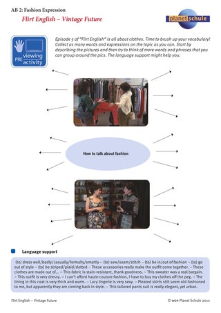 Im Anschluss aktivieren und erweitern sie ihren Wortschatz im Bereich Kleider und Mode. Auf Arbeitsblatt 2 "Fashion expression" sind Fotos aus dem Film abgedruckt und die Schüler suchen möglichst viele Wörter für die Kleidungsstücke und Accessoires. Der "language support" unterstützt sie dabei. Sie können auch Wörterbücher hinzuziehen.
