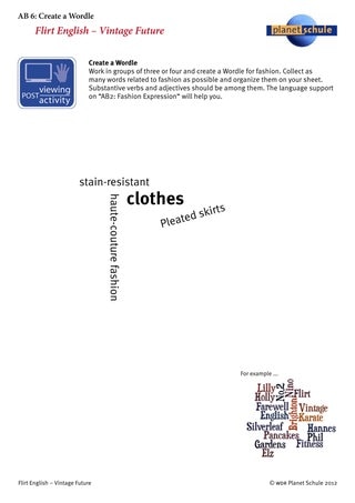 Das Thema Mode wird in Arbeitsblatt 6 wieder aufgegriffen: Als Wortschatzarbeit zum Thema bilden die Schülerinnen und Schüler in Partnerarbeit ein Wortfeld zum Thema Mode in Form eines Wordle (Arbeitsblatt 6 "Create a Wordle"). Dies kann z.B. als Vorbereitung für Schreibaufträge dienen.