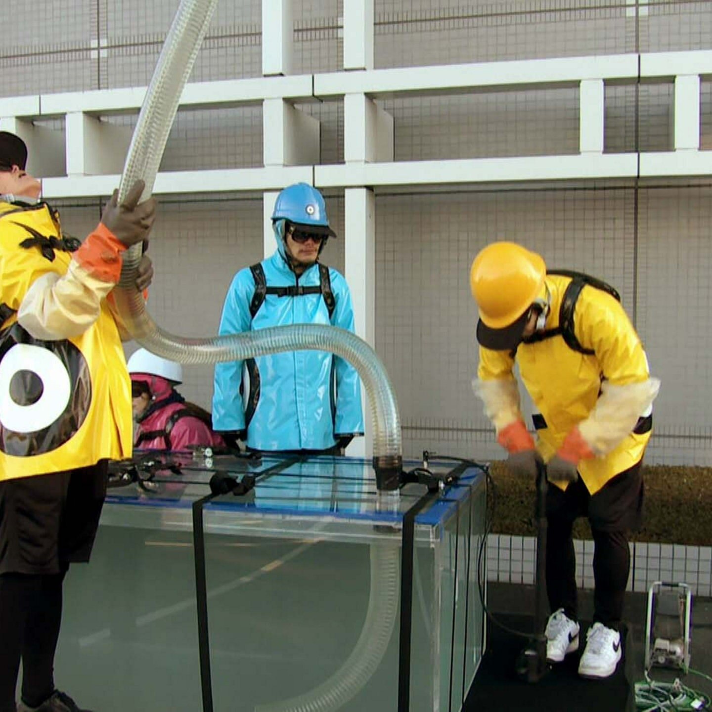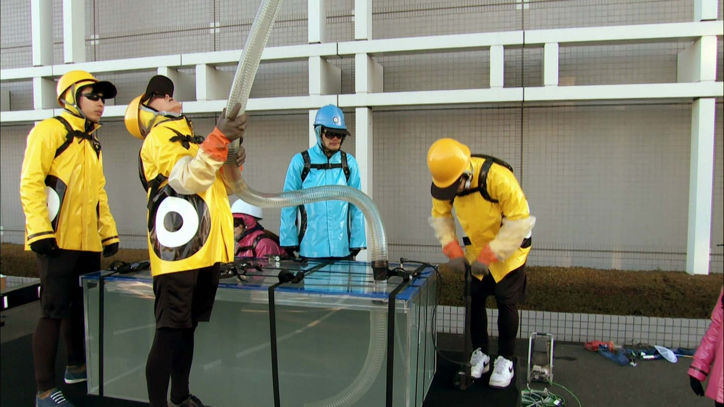 Über einen langen Schlauch sollen zweitausend Liter Wasser von einem Wassertank in einen anderen gelangen und dabei eine Höhe von zehn Metern überwinden. Ob das gelingt?