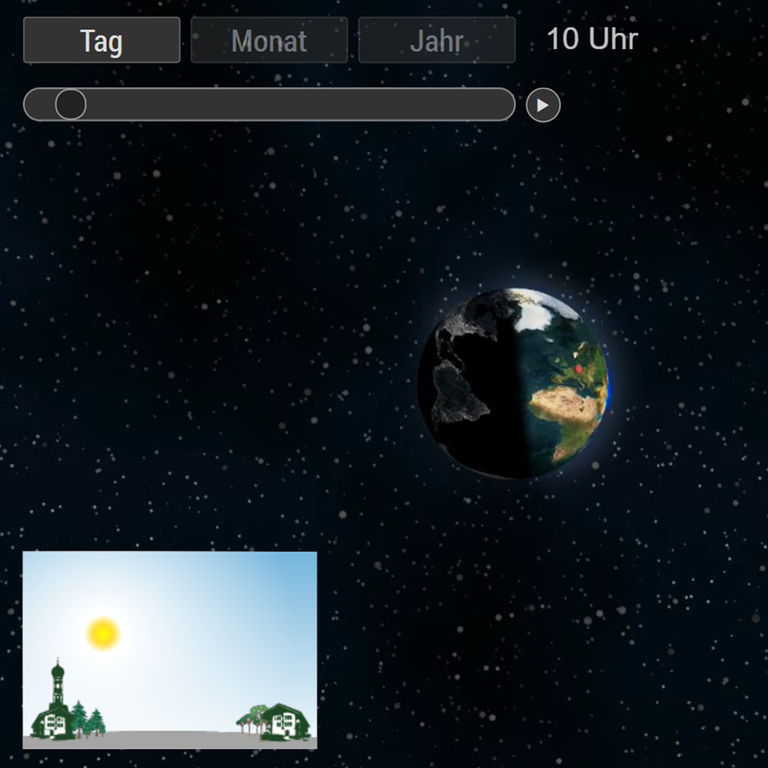 Die wohl wichtigste Zeiteinheit, die jeder Mensch wahrnimmt, ist der Tag – der Rhythmus, in dem es hell und dunkel wird. Dieser wird durch die Zeit vorgegeben, in der die Sonne scheint – letztlich also durch die Drehung der Erde um ihre Achse. Und auch die Maßeinheiten Monat und Jahr werden durch astronomische Gegebenheiten bestimmt. Die interaktive 3D-Animation verdeutlicht die Bewegungen der Himmelskörper Erde, Sonne und Mond.