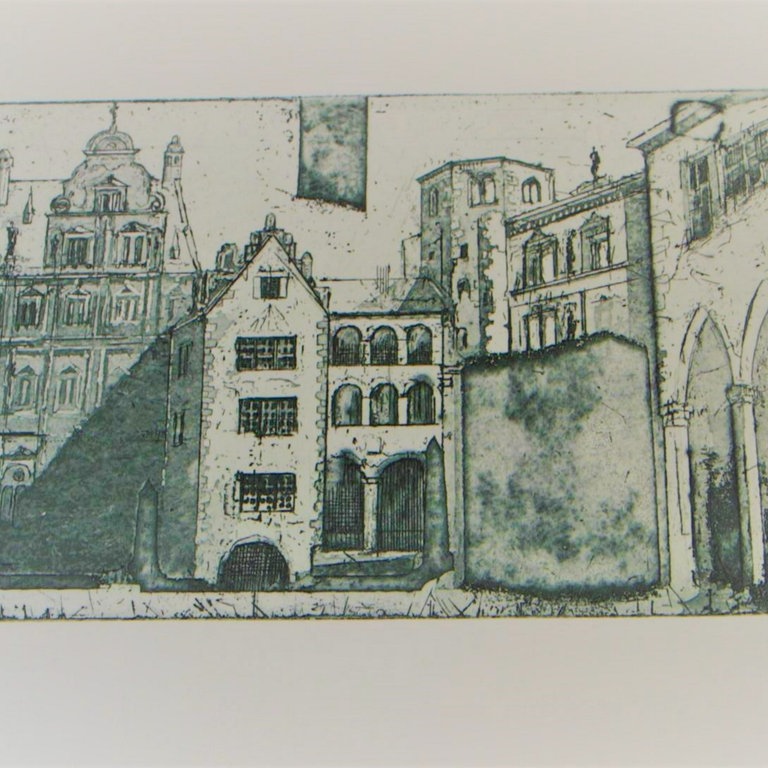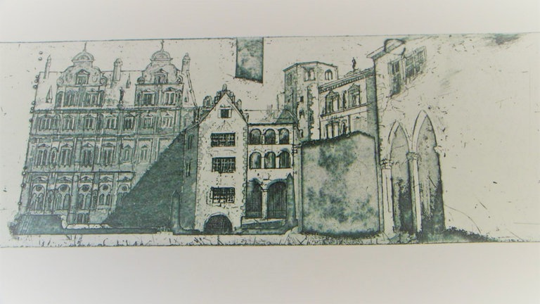 Der Künstler Stefan Becker demonstriert das Verfahren: Er zeichnet die Fassade des Heidelberger Schlosses und überträgt seine Skizze auf Pauspapier. Vorher hat er eine Kupferplatte mit einem säurefesten Lack präpariert. Nachdem dieser Ätzgrund getrocknet ist, überträgt der Künstler seine Zeichnung spiegelverkehrt auf die versiegelte Kupferplatte. Dann folgt Schritt zwei: Der Künstler kratzt, ritzt und schabt das Motiv seiner Radierung in die Lackschicht. Für die Herstellung dieser Vertiefungen benutzt er besondere Werkzeuge wie einen Kupferstichel oder eine Radiernadel. Diese Vorgehensweise gab der Radierung ihren Namen: Das lateinische Wort „radere“ bedeutet so viel wie „schaben“ und „kratzen“.