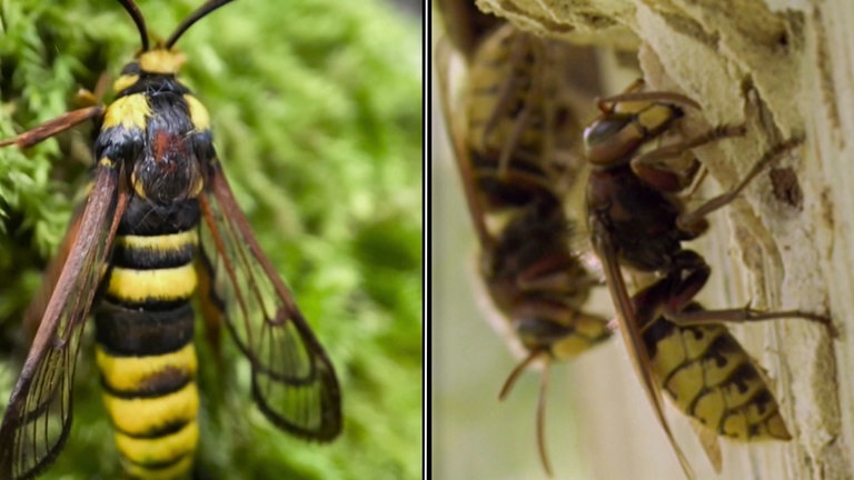 Die so genannte Schutz-Mimikry wurde zuerst von dem englischen Biologen Henry Walter Bates Mitte des 19. Jahrhunderts im brasilianischen Regenwald entdeckt und beschrieben. Nach ihrem Entdecker wird sie auch Bates'sche Mimikry genannt. Ein Beispiel für Schutz-Mimikry liefert die Wespenschwebfliege, die mit ihren schwarz-gelben Streifen aussieht wie eine Gemeine Wespe. Im Gegensatz zu dieser hat sie aber keinen Giftstachel und ist völlig harmlos. Ein Vogel, der sich einmal an einer echten Wespe „verschluckt“ hat, wird die Schwebfliege ihrer Ähnlichkeit wegen dennoch in Ruhe lassen. Ganz ähnlich geht der Hornissenschwärmer vor: Der harmlose Schmetterling schützt sich mit einer Warntracht, indem er das Aussehen von einschüchternden Hornissen nachahmt. Der schwarz-weiß gestreifte Schlangen-aal wiederum imitiert zu seinem eigenen Schutz die giftige Gelblippenseeschlange. Und die Haut der Weinschwärmer-Raupe hat eine Musterung, die aussieht wie Schlangenaugen. Das soll potentielle Feinde verleiten, die Raupe für eine Schlange zu halten.