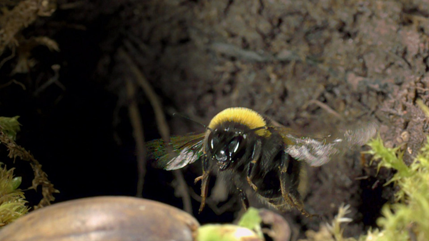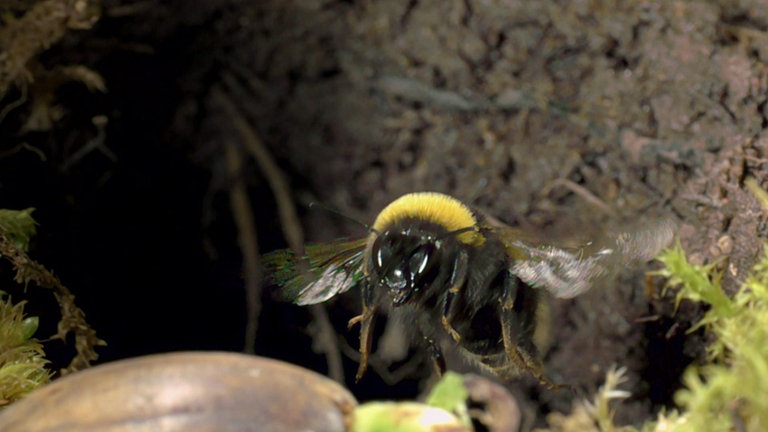 Die Erdhummeln haben faszinierende Strategien entwickelt, um sich vor Gefahren zu schützen: Wird es zu heiß im Hummelnest, werfen die Arbeiterinnen ihre eigene „Klimaanlage“ an: Sie kühlen die Luft mit heftigem Flügelschlagen. Wird es zu nass, fächeln die Erdhummeln ihre Brut trocken und saugen das Regenwasser ab. Auf diese Weise wird die Brut gerettet.