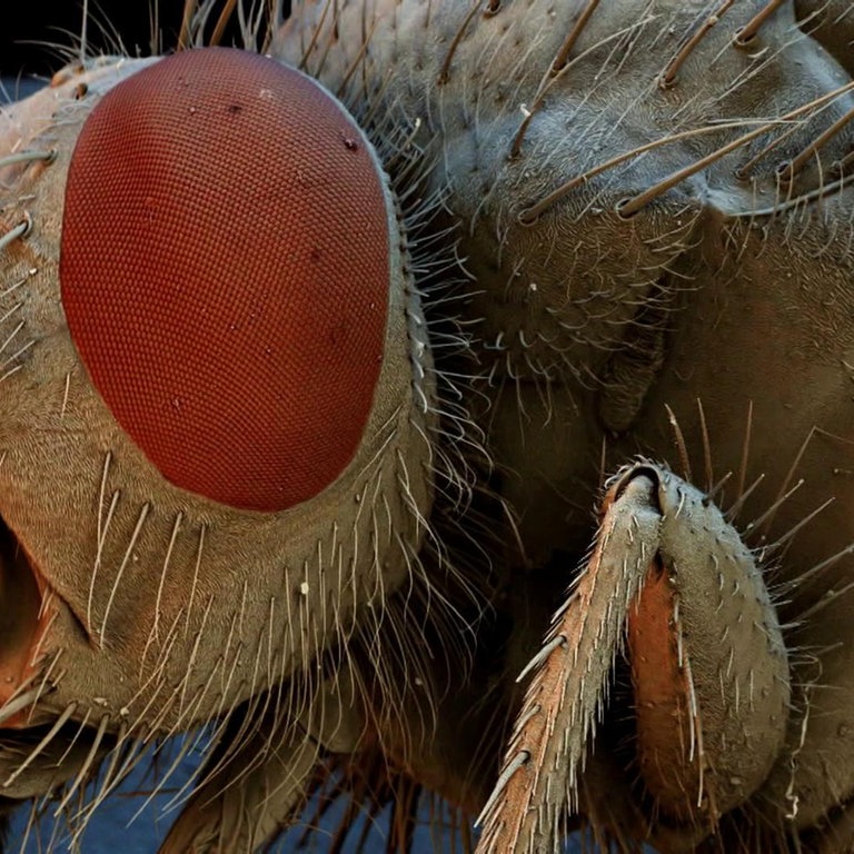 Jeder kennt die Situation: Eine Stubenfliege schwirrt hartnäckig umher, es ist aber beinahe unmöglich sie mit der Hand zu fangen. Die Fliege ist einfach schneller – und das, obwohl sie im Durchschnitt nur sieben Millimeter groß ist und 20 Tage lang lebt. Von weitem betrachtet, scheint die Stubenfliege, genau wie der Mensch, nur zwei Augen zu haben. Tatsächlich hat sie zwei Facettenaugen, die aber jeweils aus tausenden sechseckigen Einzelaugen bestehen. Jedes Einzelauge hat Sinneszellen, die das Licht aus unterschiedlichen Blickwinkeln verarbeiten. Die Stubenfliege hat sozusagen einen eingebauten Rundumblick, während der Mensch ein begrenztes Gesichtsfeld hat.